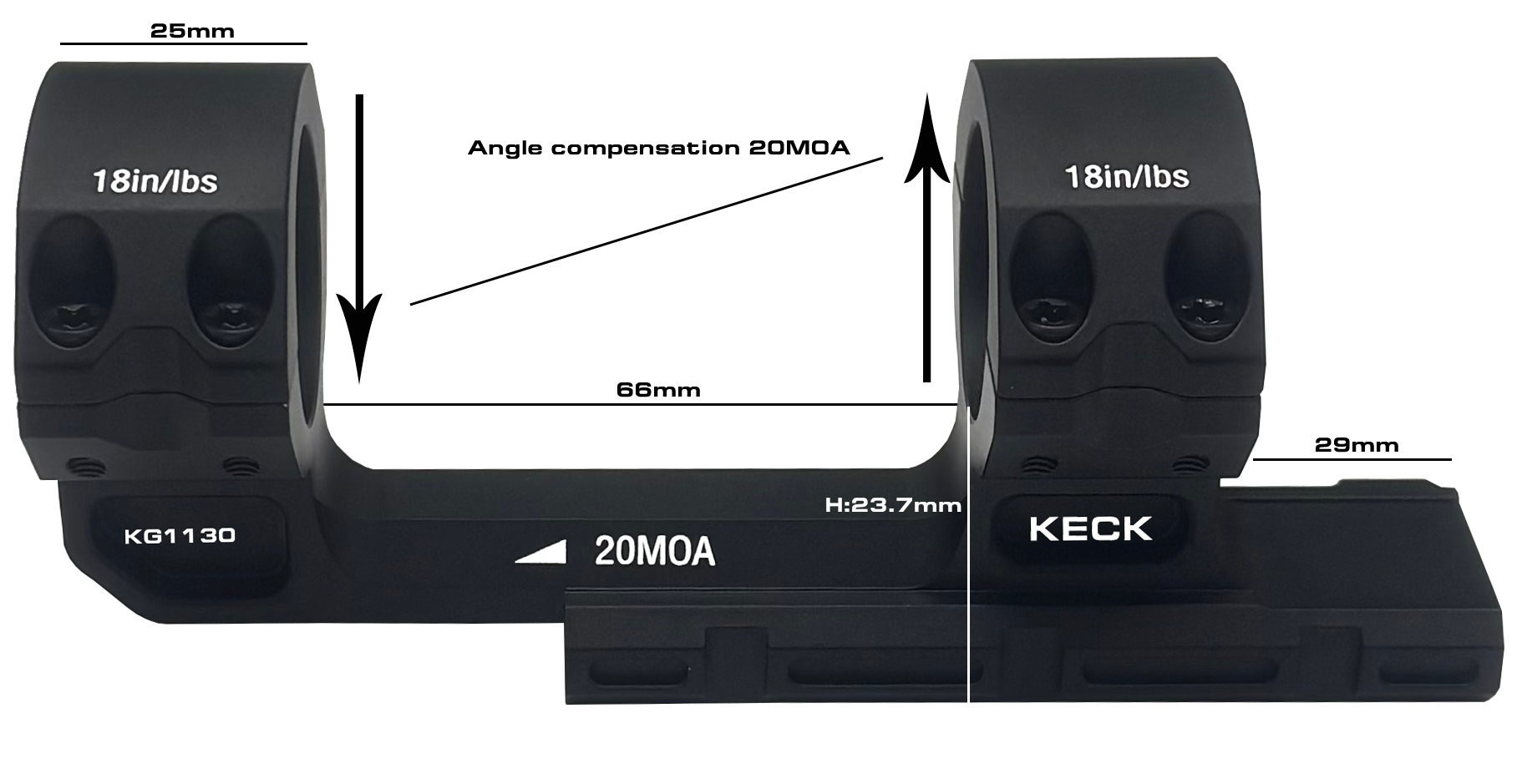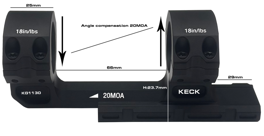 HIGH MOUNT - Base Height :23.7 mm - Centre of Ring to Rail: 40.7 mm INCLINE: 20 MOA