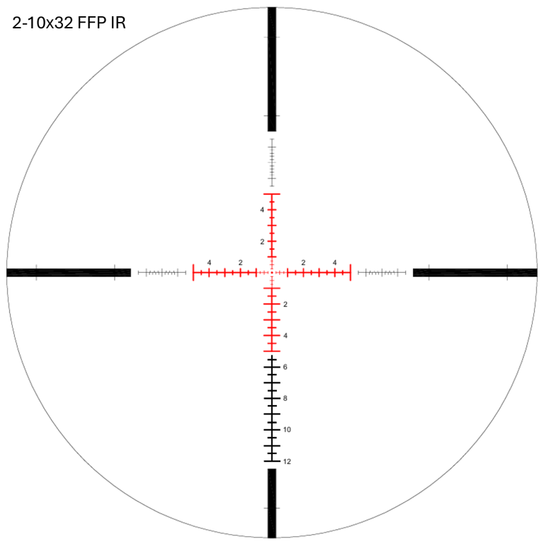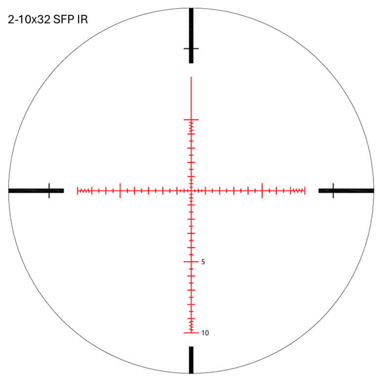 The PRECISION ED 2-10x32 SFPIR uses a Mil line reticle offering 0.25 aim points within the centre cross.